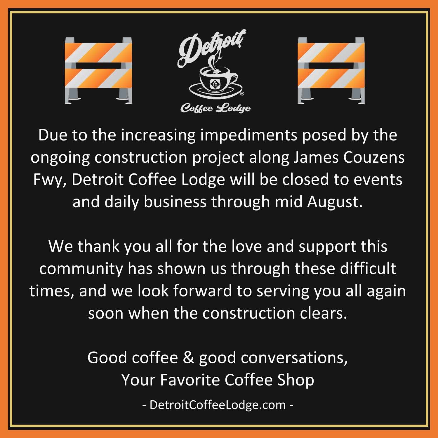 Due to the increasing impediments posed by the ongoing construction project along James Couzens Fwy, Detroit Coffee Lodge will be closed to events and daily business through mid August.